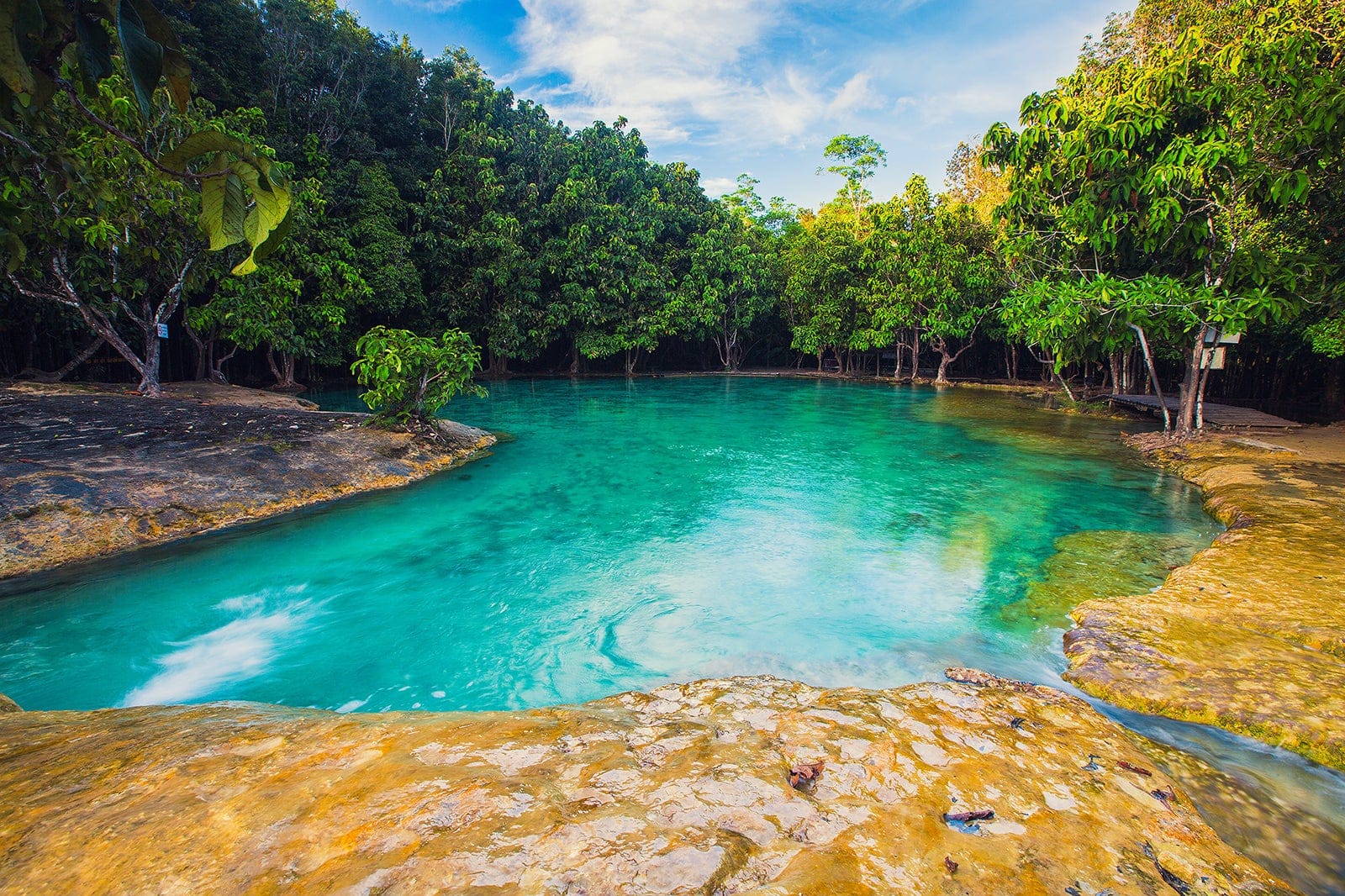 The Emerald Pool is a famously vibrant natural pond in the Thung Teao Forest Natural Park. The park is a lowland forest rich in biodiversity, complete with a nature trail.